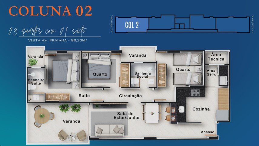 COLUNA 02: Frente para Avenida Oceânica - 88,20m² - 3 quartos R$ 872.800,00 ( uma coluna que diferenciada também pela ventilação cruzada e o sol da manha nos quartos )