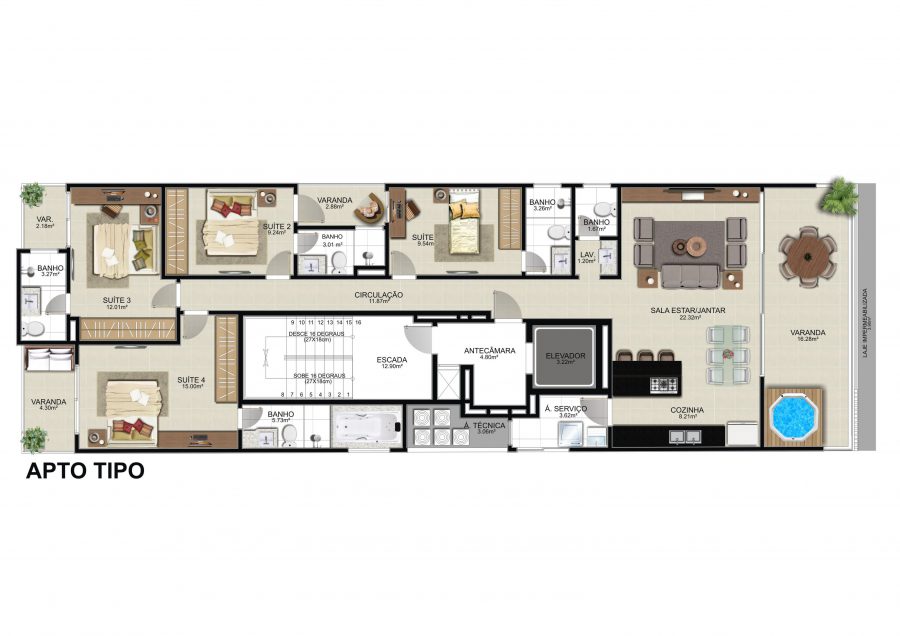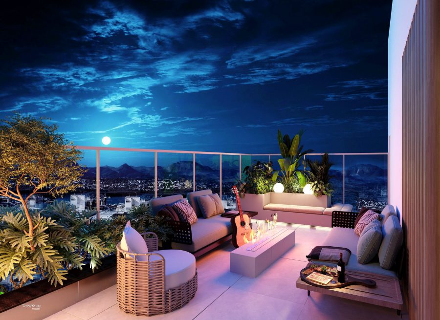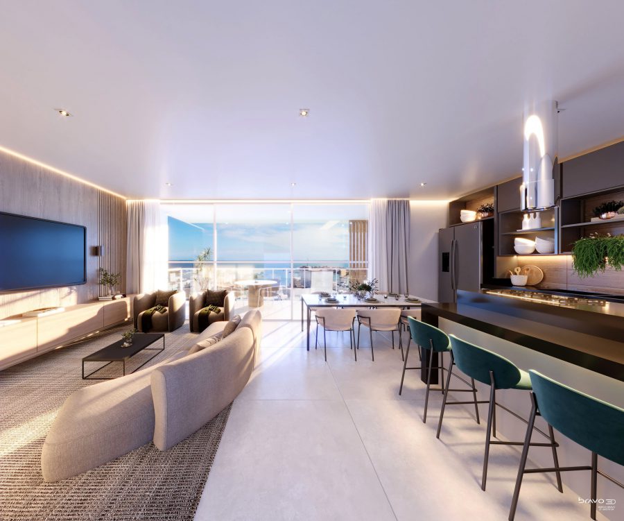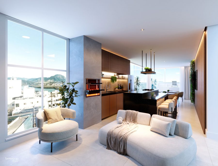 O design do apartamento separa de forma harmoniosa a área social da área íntima. A cozinha, sala de estar e varanda com ofurô são espaços integrados, ideais para momentos de convivência e lazer. Já os quartos posicionados estão em uma área mais reservada, garantindo silêncio e tranquilidade.