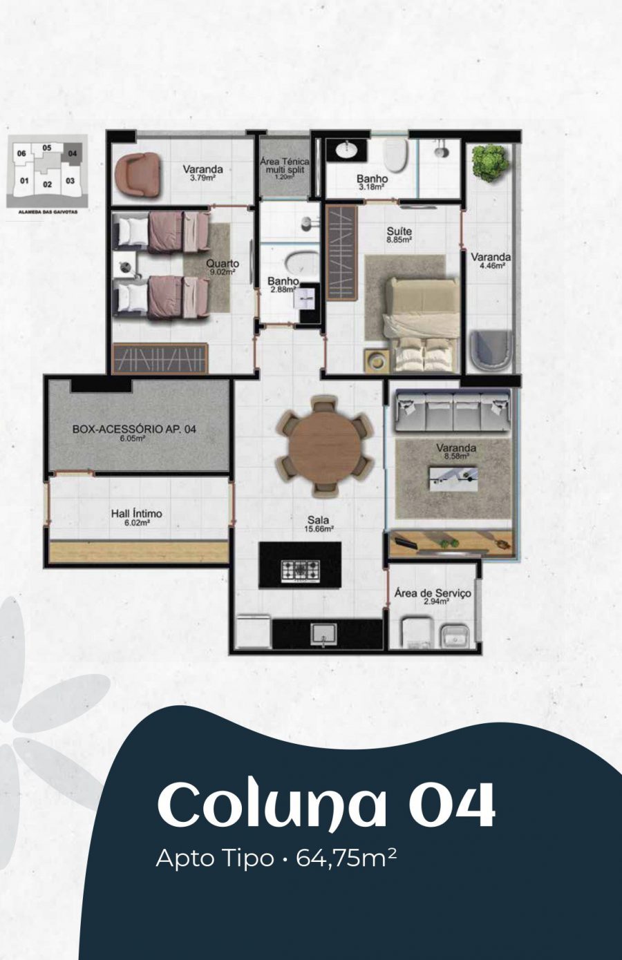 Projetados com acabamentos de alta qualidade, os apartamentos da coluna 04 possuem uma excelente disposição que maximiza a luz natural e a ventilação, criando um espaço acolhedor e agradável para viver.