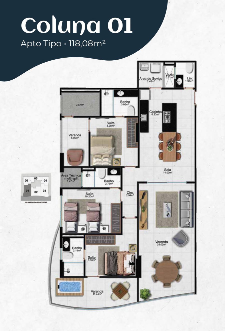Descubra o conforto e a sofisticação da Coluna 01 do Magdala Residencial, uma unidade projetada para oferecer um estilo de vida exclusivo e contemporâneo. Com uma área generosa de 118,08 m², esta unidade possui três suítes, proporcionando privacidade e conforto para toda a família.