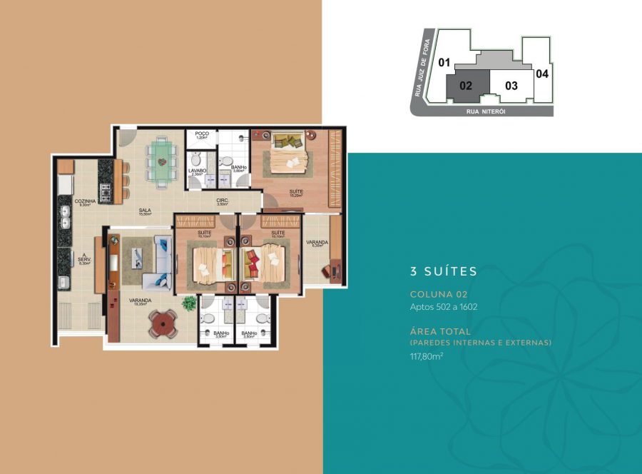 •Coluna 02: 117 m² - 3 suítes