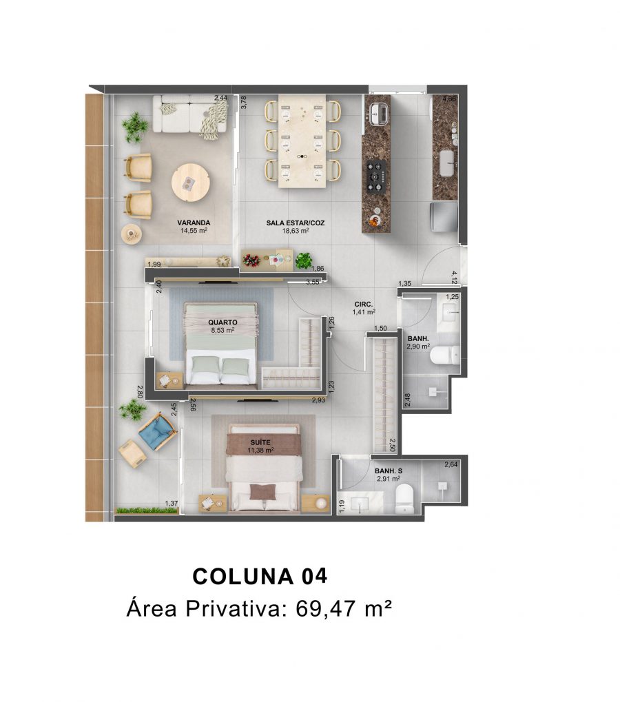 Coluna 4 - Área Privativa de 69,97m²: