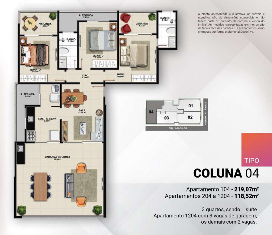 Explore o apartamento da Coluna 4 no Edifício JAIRO MERGÁR DE CARVALHO. Com uma área de 118,50m², este espaço oferece 03 quartos, incluindo 01 suíte, uma sala confortável, varanda gourmet, 01 varanda adicional, cozinha com área de serviço, área técnica e 02 vagas de garagem.
