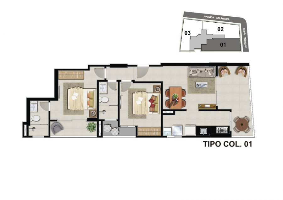 A Coluna 01 apresenta um apartamento espaçoso com 2 quartos, sendo um deles uma suíte, abrangendo uma área total de 70,67m². Este espaço foi cuidadosamente projetado para garantir comodidade e funcionalidade em cada detalhe.
