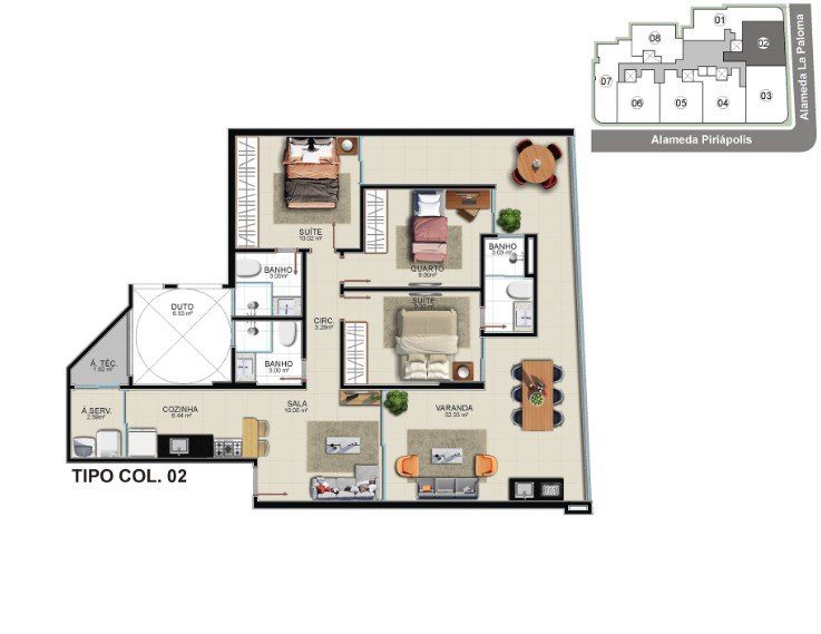 •Coluna 02: 105,11 m² - 3 quartos