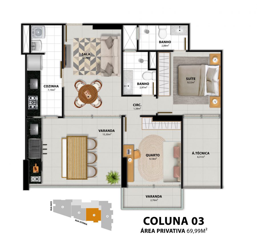 COLUNA 03 - 69,99M² - 2 QUARTOS SENDO 1 SUÍTE - A PARTIR R$ 617.500,00